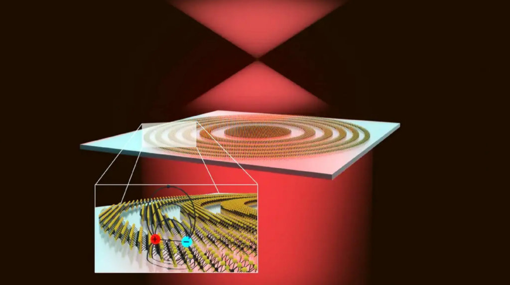 The developed lens is made from concentric rings of tungsten disulphide (WS2) with gaps in between, which absorb red light and reemits it at a focal point 1 mm away from the surface. This is also called a ‘Fresnel lens’ or ‘zone plate lens’. Other wavelengths pass through unaffected, since the lens selectively focuses red light.
